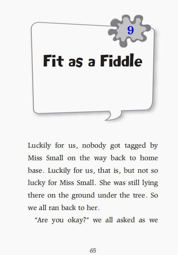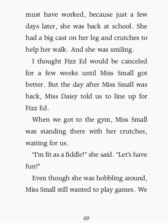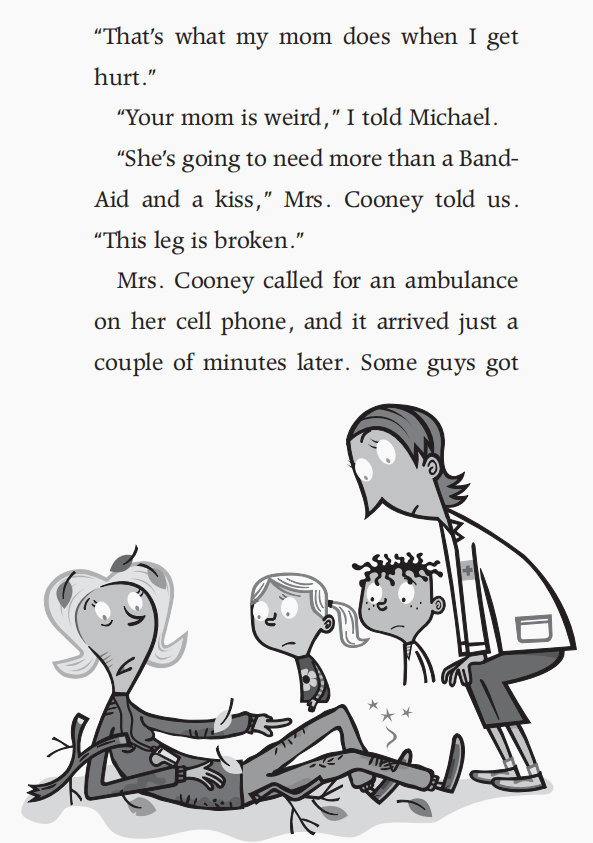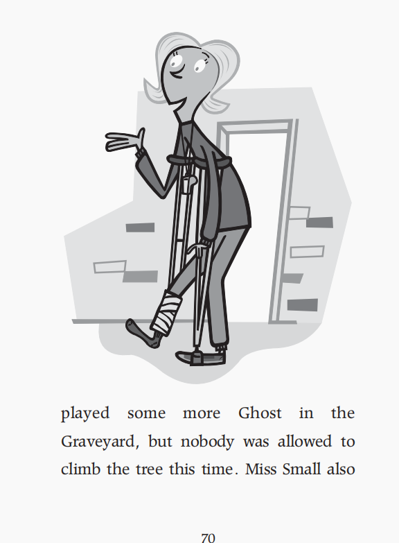 她疼得起不来了,同学们都很着急,A.J.迅速跑去找了学校护士Cooney太太。Cooney太太说Small小姐的腿摔断了,并叫来了救护车。同学们回到班里,马上给Small小姐写了康复卡,而这些康复卡看来真奏效了,几天后,Small小姐就回到了学校。她的腿上虽然打了石膏,拄着拐杖,但她情绪很好。第二天,A.J.他们又有体育课了,他们还玩了会儿“墓地里的鬼魂”游戏,不过这次大家都不可以爬树了。A.J.仍然希望他们能在体育课上打篮球、踢足球之类,但他也不得不承认,Small小姐教的那些过时的游戏也挺有意思的。也许体育课也并没那么糟