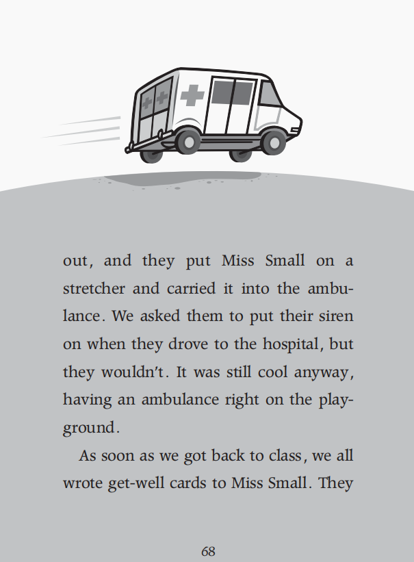 Cooney太太用手机叫了救护车,几分钟后,它就到了。几个人下车,把Small小姐抬上担架,推进救护车里。我们请他们在去医院的路上鸣警笛,但他们没有。不过,有一辆救护车在操场上还是很酷的。