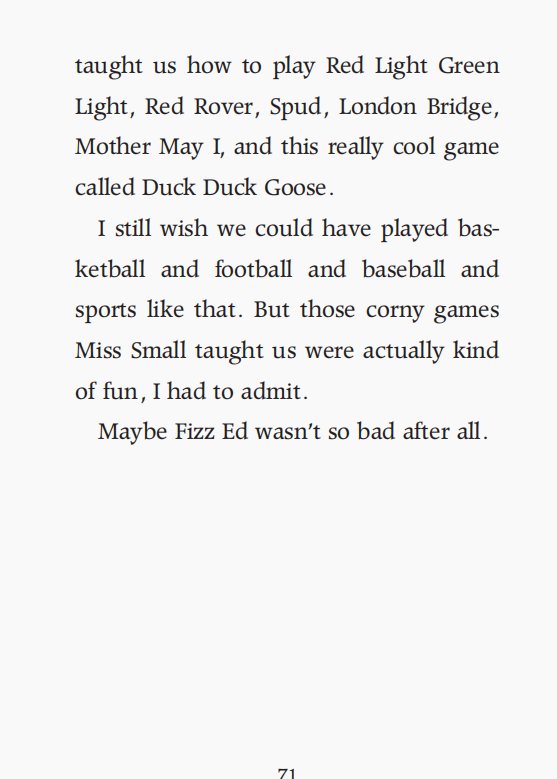 我还是希望我们能打篮球,玩橄榄球和棒球等这样的运动。但Small小姐教我们的那些过时的游戏也的确挺好玩的,我不得不承认。