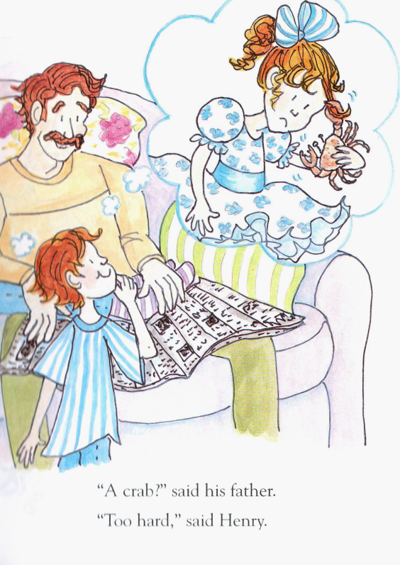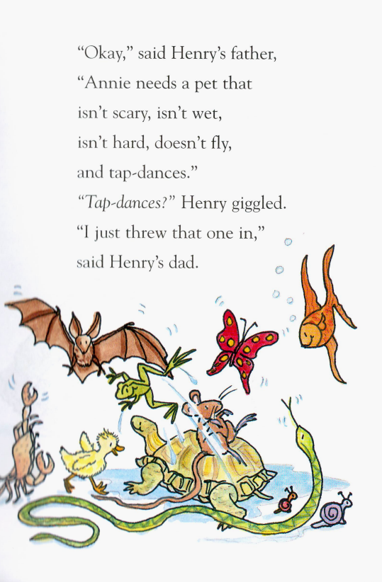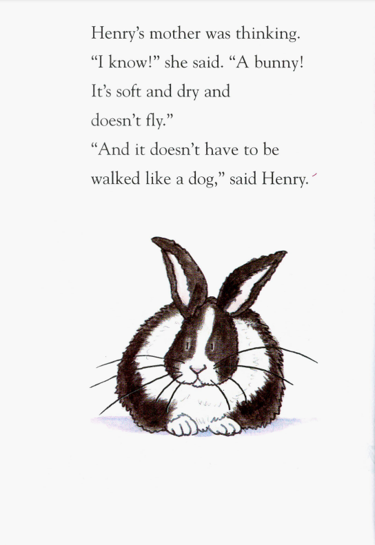 Henry的爸爸妈妈提出了一些建议,比如养一只老鼠、乌龟、螃蟹、小鸟等,但都被Henry否定了,因为他觉得那些都不适合Annie。然后爸爸总结:Annie需要的宠物是不吓人的,不湿不硬,不能飞的......最后Henry妈妈终于想出了一种合适的动物:小兔子。