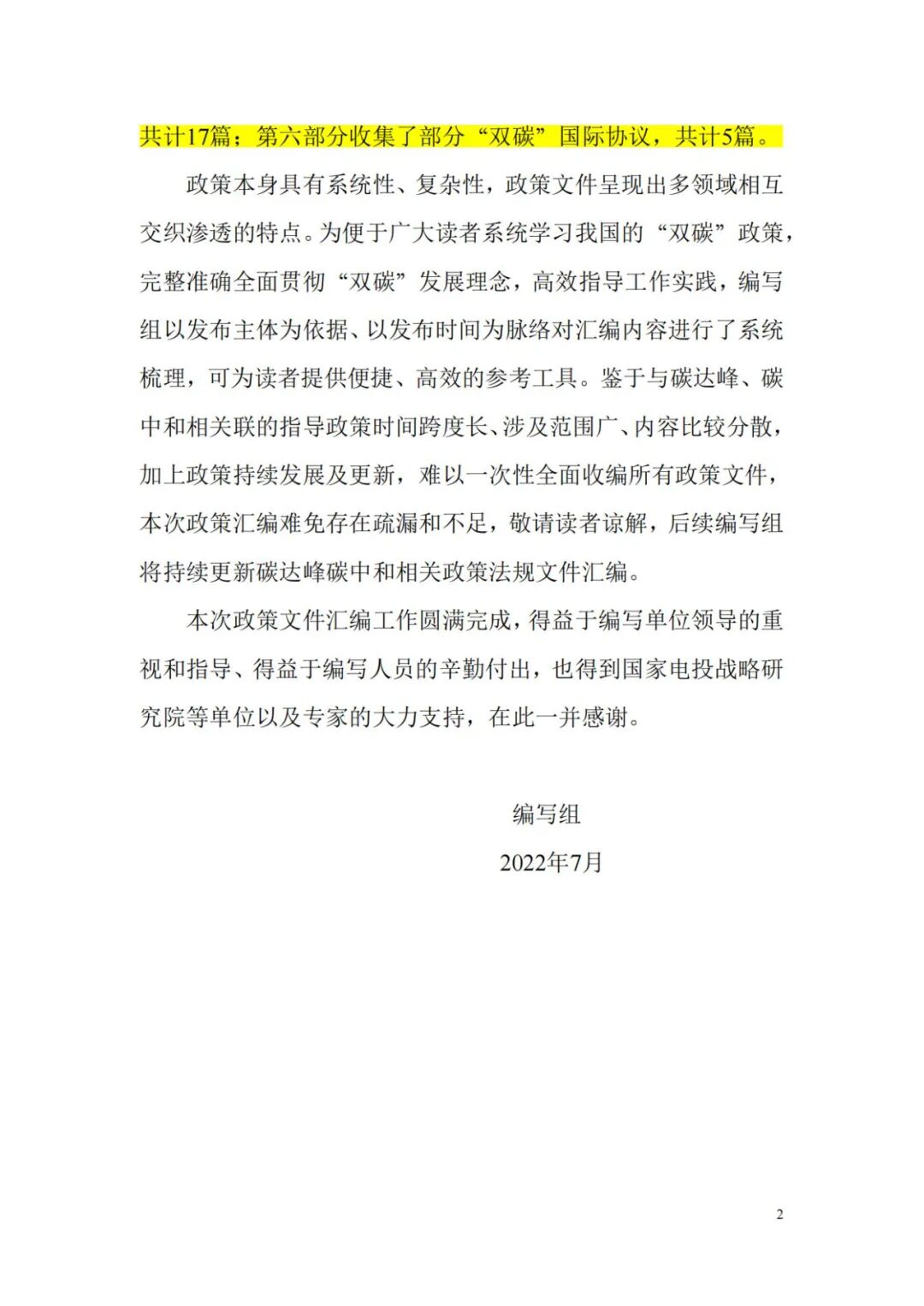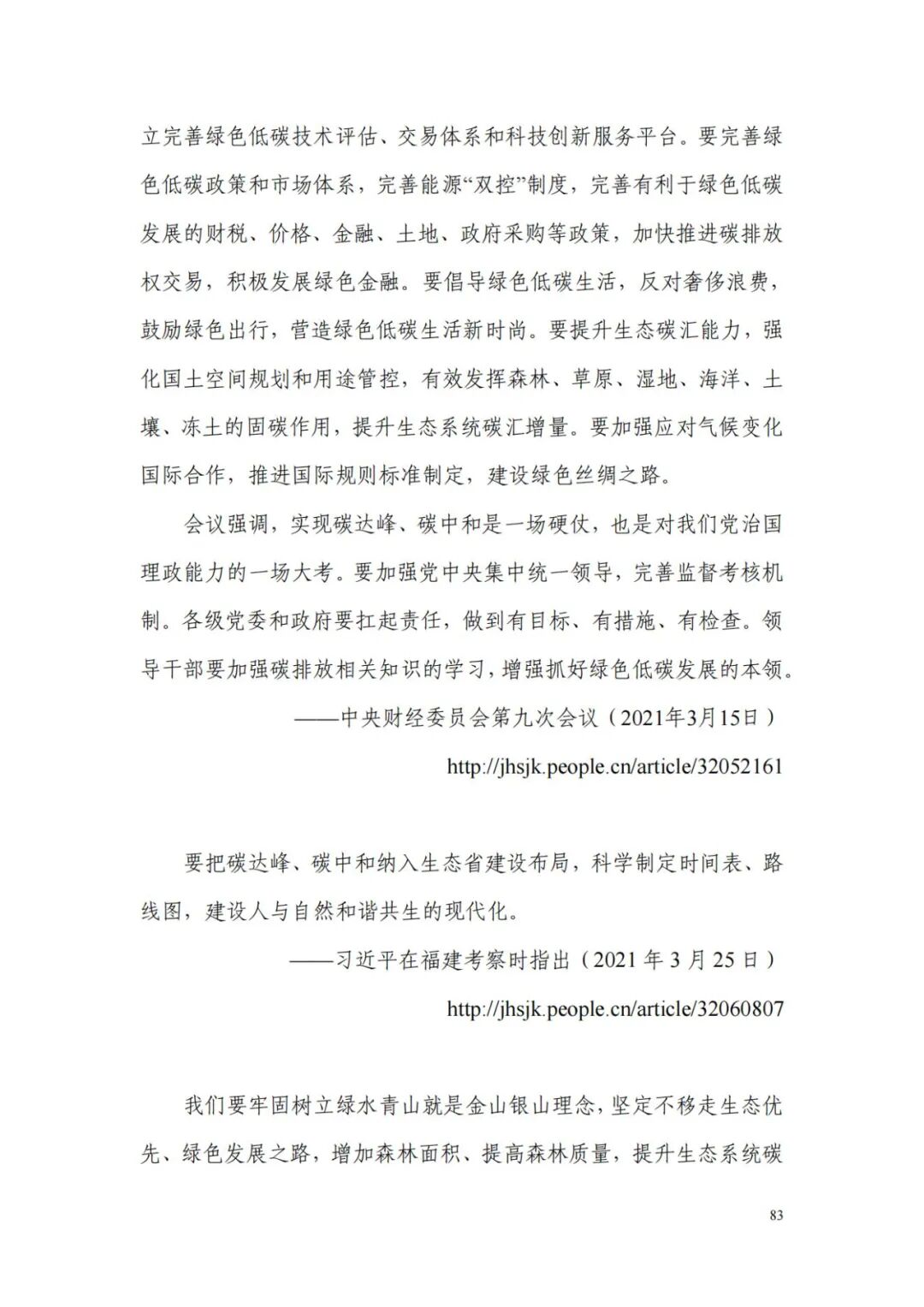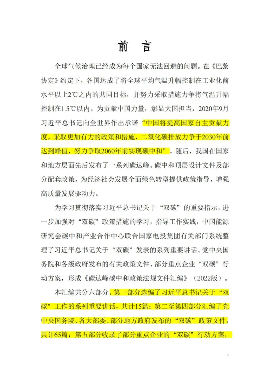 本报告共分六部分。第一部分选编了习近平总书记关于“双碳”工作的系列重要讲话,共计15篇:第二至第四部分汇编了党中央国务院、各大部委、部分地方政府发布的“双碳”政策文件,共计65篇;第五部分收录了部分重点企业的“双碳”行动方案,共计17篇:第六部分收集了部分“双碳”国际协议,共计5篇。