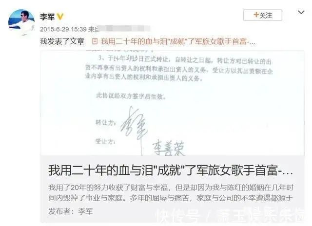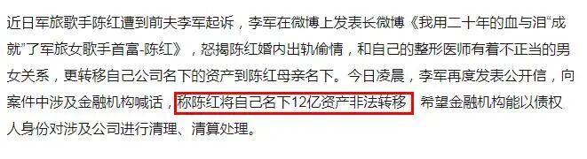 2015年,李军在网上公开发文,称陈红平日里没有收入,花钱却大手大脚,花掉了自己上亿的财产。