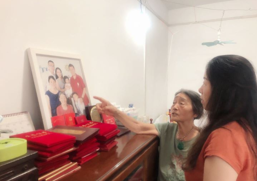 2021年夏天,侵华日军南京大屠杀遇难同胞纪念馆副馆长凌曦与工作人员上门看望王素明奶奶,她自豪地介绍她的孙辈们。