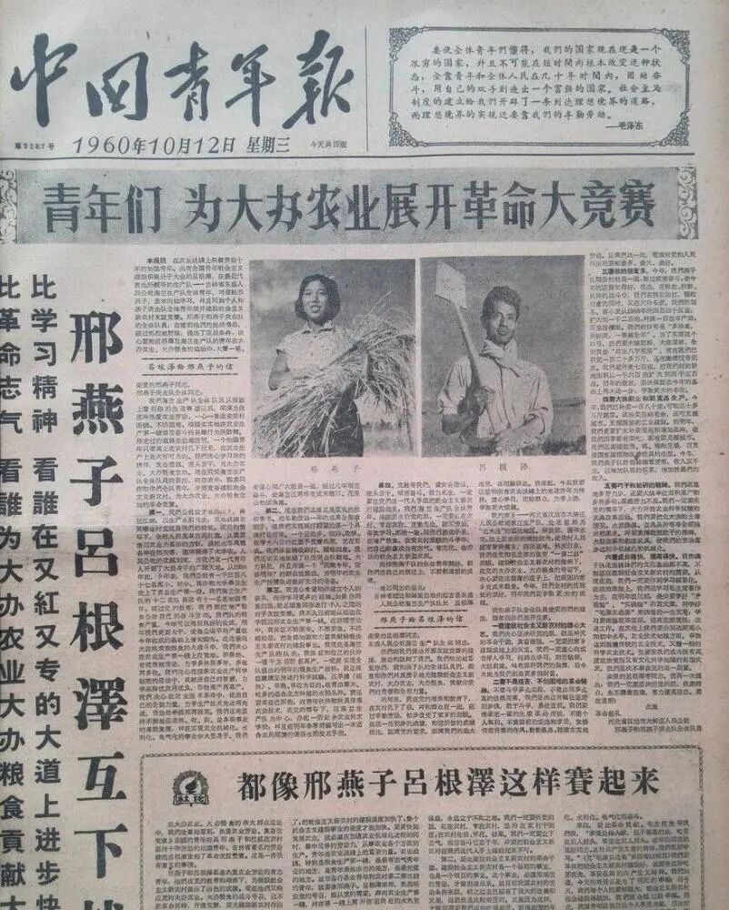 1960年,《人民日报》发表长篇通讯介绍了邢燕子的先进事迹,时任全国人大常委会副委员长的郭沫若,专门创作了《邢燕子歌》,对邢燕子的事迹大加称颂。