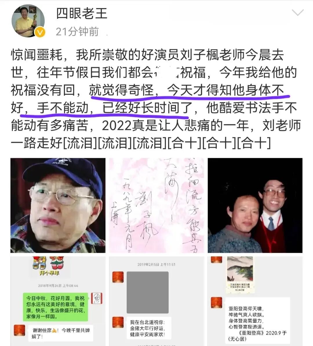 得知好友刘子枫5月7日去世的消息后,上海影城原副总经理在自己的社交平台上感叹,自己过年的时候发给刘子枫的新年祝福他没有回的时候就觉得奇怪了。原来,刘子枫是因为身体不好,酷爱书法的他却在离世前很长一段时间手不能动,对他来说,痛苦可想而知。