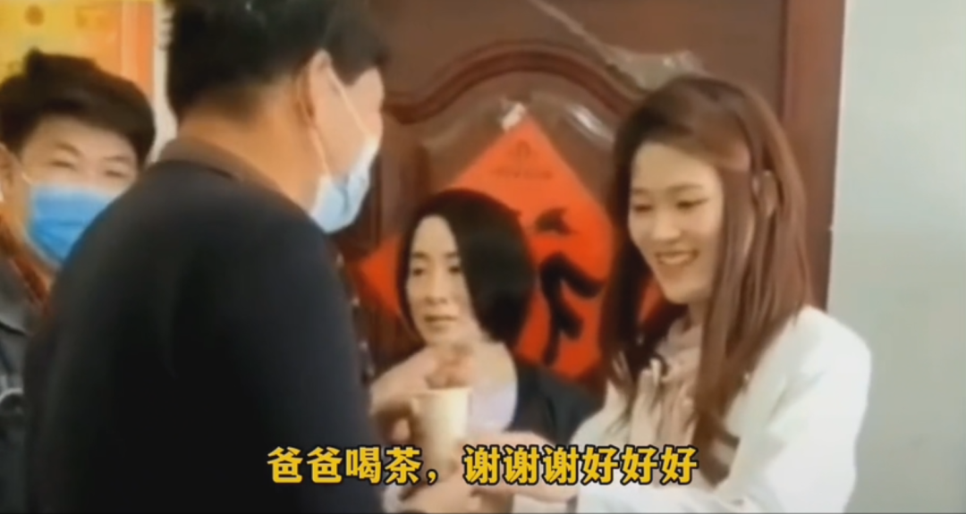 这位身穿白色外套长发披肩的女子,手里捧着茶端到大衣哥面前,脸上全程挂满笑容:“爸爸喝茶”。