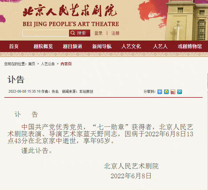 今天,北京人民艺术剧院发文声称表演艺术家蓝天野老师在家中病逝,享年95岁。