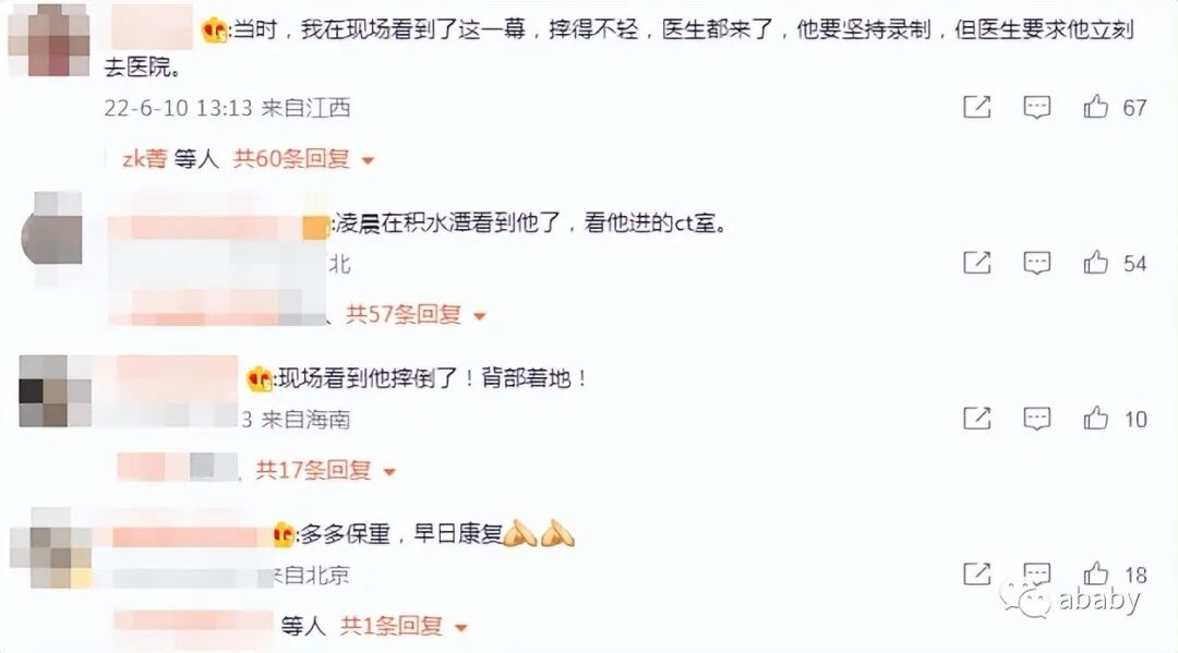 有人说:当时,我在现场看到了这一幕,摔得不轻,医生都来了,他要坚持录制,但医生要求他立刻去医院;