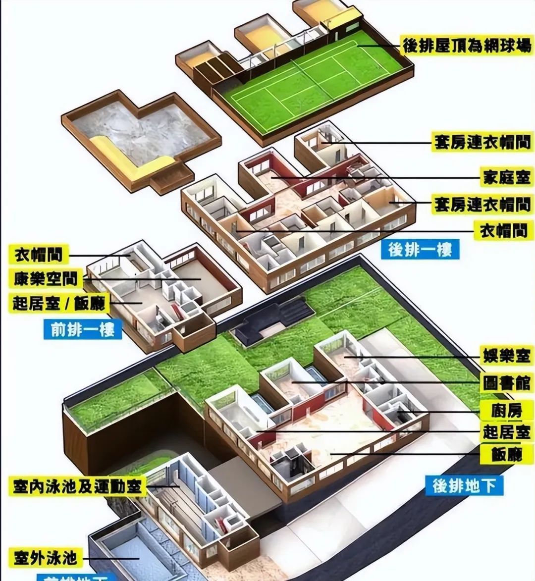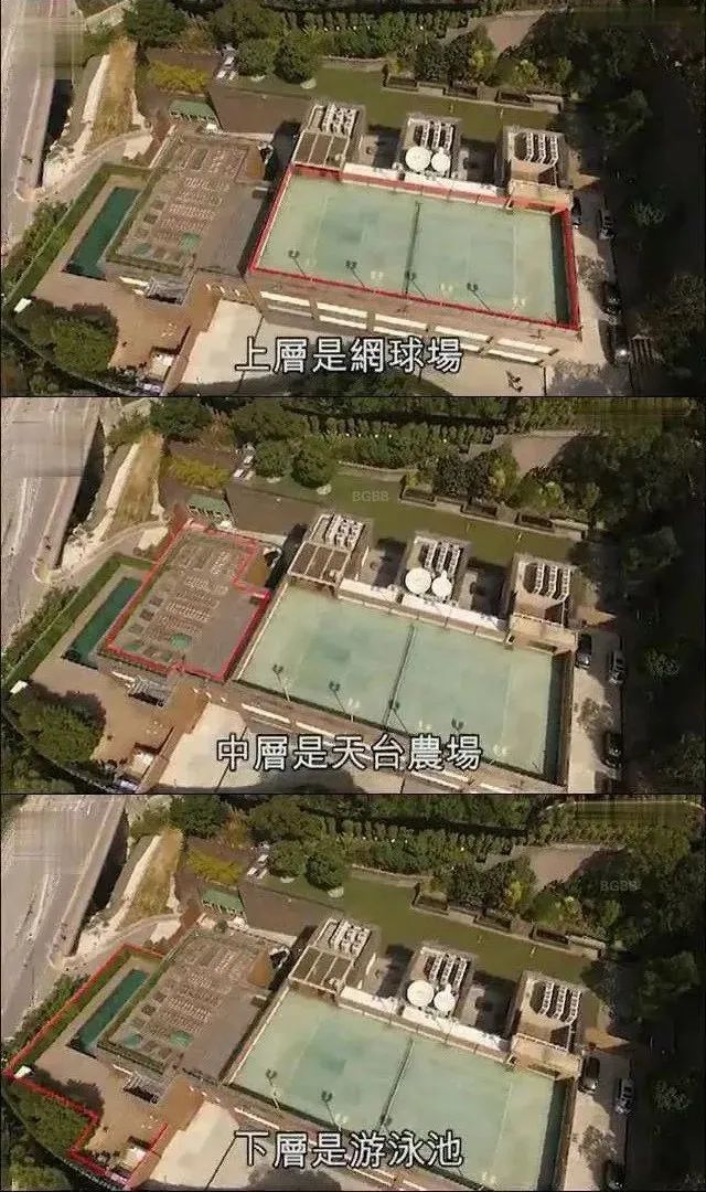 顶层天台是网球场,是为两个喜欢打网球的女儿而建,据说花了3个亿;