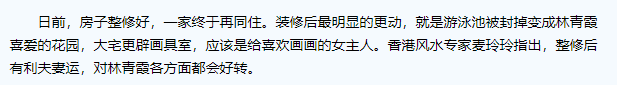除了公寓,林青霞在文中,也提到了自己和丈夫住的“大屋”。