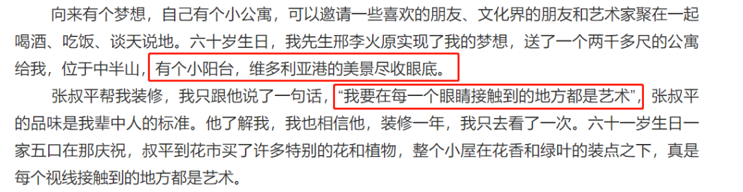在文章中,林青霞提到,这座小公寓是先生送她的60岁生日礼物。