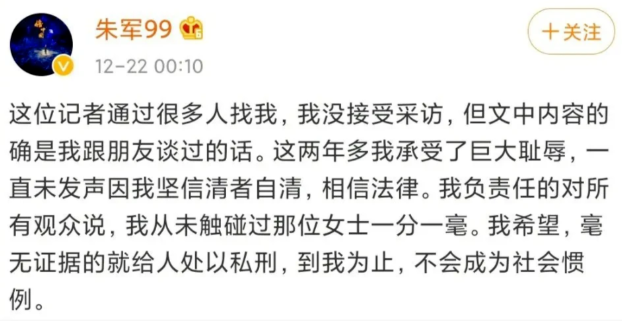 2020年12月22日,朱军回应,坚称自己是清白的,表示自己承受了巨大的耻辱:“这两年多我承受了巨大耻辱,一直未发声因我坚信清者自清,相信法律。我负责任的对所有观众说,我从未触碰过那位女士一分一毫。我希望,毫无证据的就给人处以私刑,到我为止,不会成为社会惯例”。