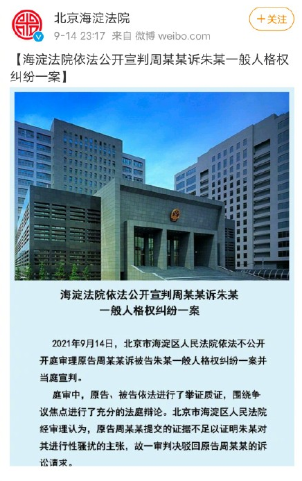去年9月14日晚,北京市海淀区人民法院依法不公开开庭审理原告周某某诉被告朱某一般人格权纠纷一案并当庭宣判。原告周某某提交的证据不足以证明朱某对其进行性骚扰的主张,故一审判决驳回原告周某某的诉讼请求。