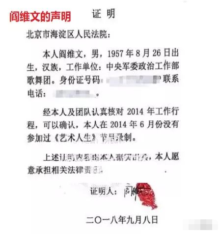 然而阎维文发表了声明,表示自己当时根本没有参加《艺术人生》的节目录制。