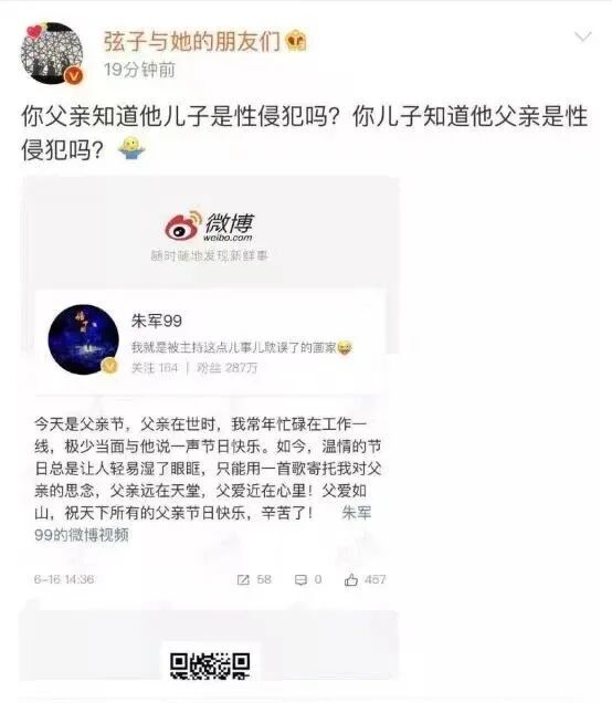 2020年父亲节,朱军非常罕见地发了一条微博,纪念自己过世的父亲,不过随后,大家就在弦子的微博上看到了以下这条微博: