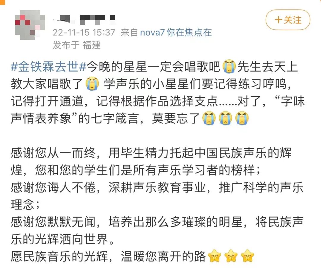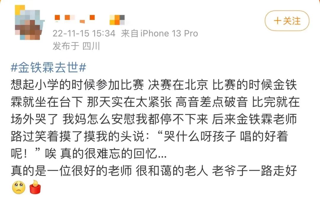 11月15日,中国音乐学院官网发布讣告,金铁霖因病医治无效,于2022年11月15日11时23分在北京逝世,享年83岁。