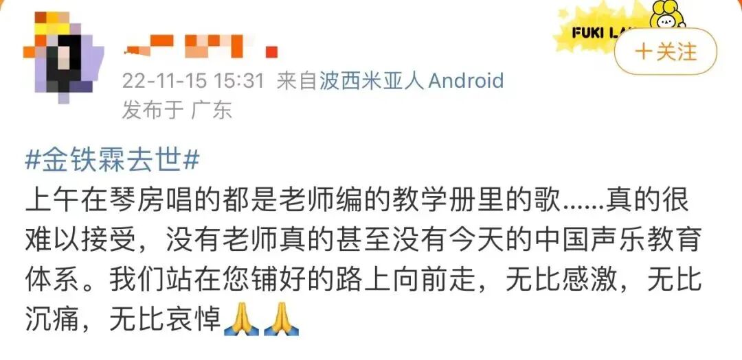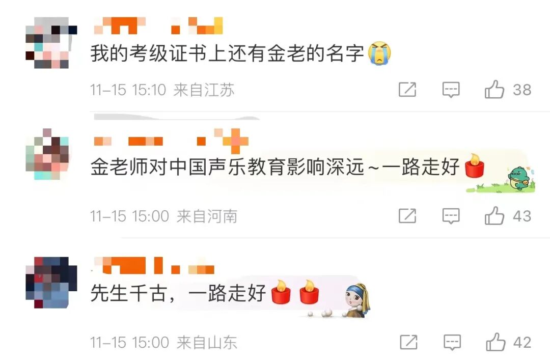 代表作《好运来》《为了谁》的歌唱家祖海,发文悼念金老师,表示有太多的话哽咽在喉,悲痛在心。