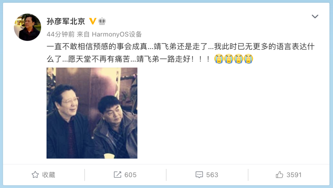 刘备的扮演者孙彦军发哀悼:一直不敢相信预感的事会成真…靖飞弟还是走了…我此时已无更多的语言表达什么了…愿天堂不再有痛苦…靖飞弟一路走好!!!