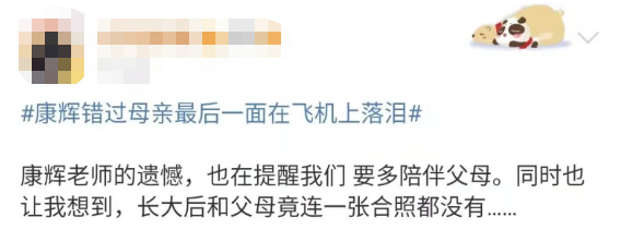 他在飞机上十几个小时都没有休息,而是把对母亲的思念写成了一篇文章。在昏暗的客舱里,康辉一边流泪,一边写下了文章《写给妈妈,不是祭文的祭文》。