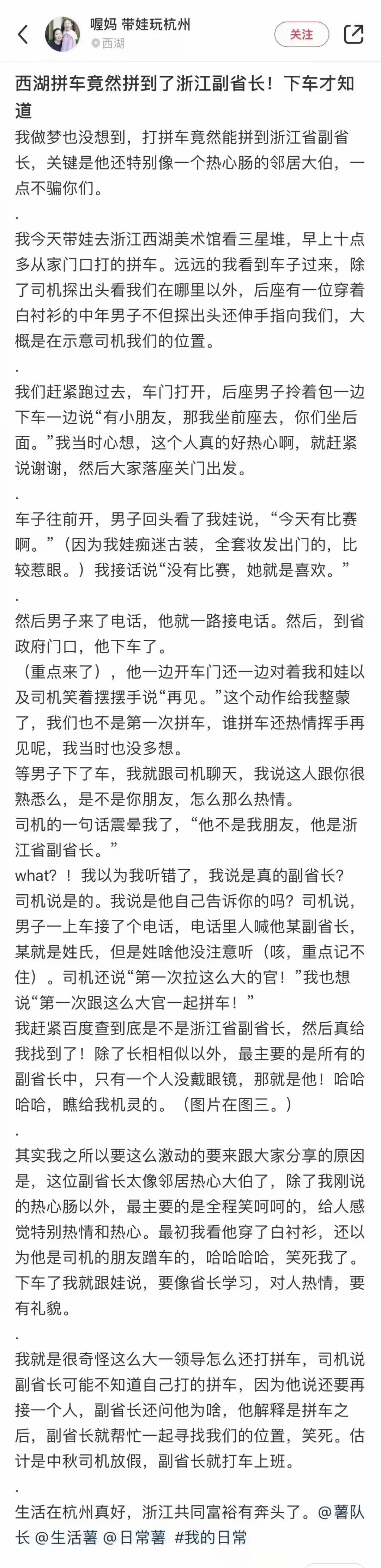今年9月份,有位小红书博主的博文,在网上悄悄流传:922无车日,这位博主拼车到西湖游玩,竟然疑似拼到了一位副省长。