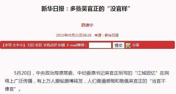 5月20日,中央政治局原常委、中纪委原书记吴官正所写的“江城琐忆”在网络上广泛传播,有上万人跟帖跟博转发,人们普遍感慨和敬佩吴官正的“当官不像官”。