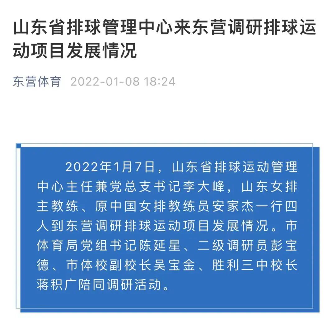 近日山东排球管理中心官网晒出了一则消息,那就是安家杰作为山东女排主教练前往山东省东营市调研基层排球项目的开展情况,这样也就表示安家杰可能提前无缘巴黎周期带领中国女排继续征战国际赛场。