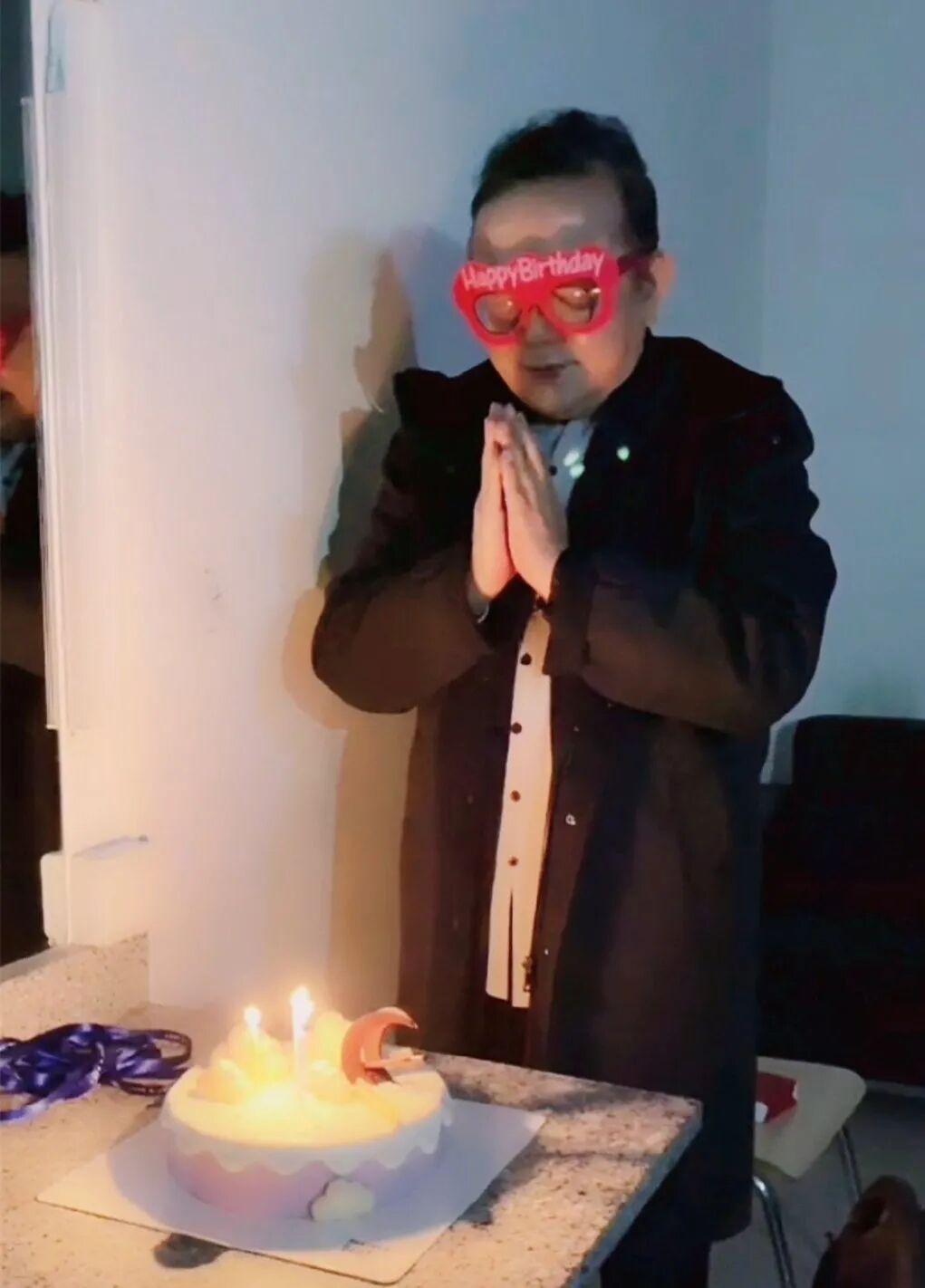 照片中,他带着粉红色的卡通眼镜,头顶上一团稀疏的短发微卷,脸蛋圆嘟嘟不见皱纹,额头光滑饱满,他面带微笑举手比耶,状态非常好,一点都不像是73岁的样子。