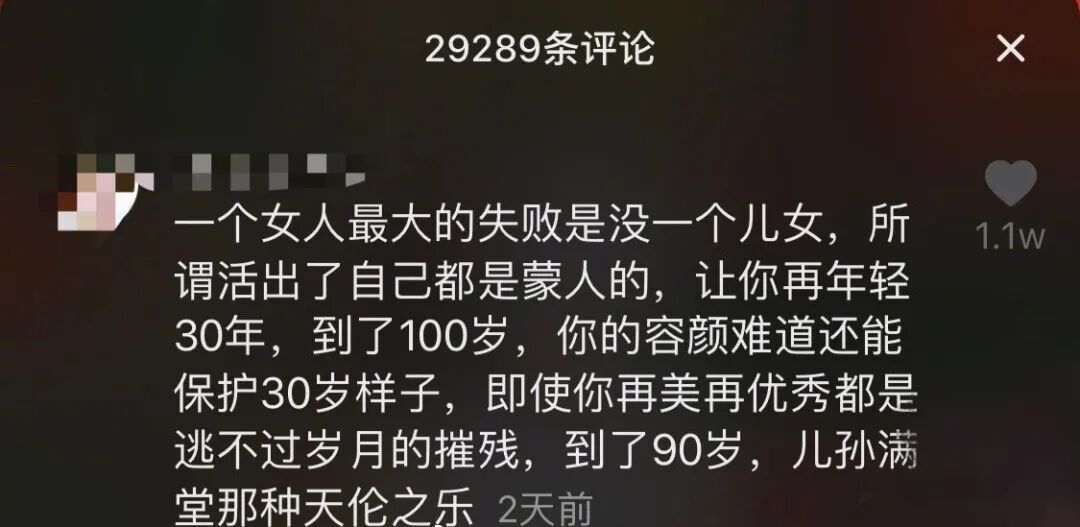 有人曾在她的视频下评论“一个女人最大的失败是没有儿女”,不能享受到“儿孙满堂的天伦之乐”,获得了上万网友的点赞,甚至类似的评论,数不胜数,更有人说“还不如做个平常女子”?