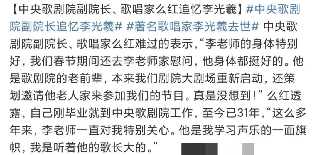 2022年3月13日17点25分,中央歌剧院国家一级演员、老一辈艺术家、著名男高音歌唱家李光羲因突发脑梗在北京朝阳医院逝世,享年93岁。