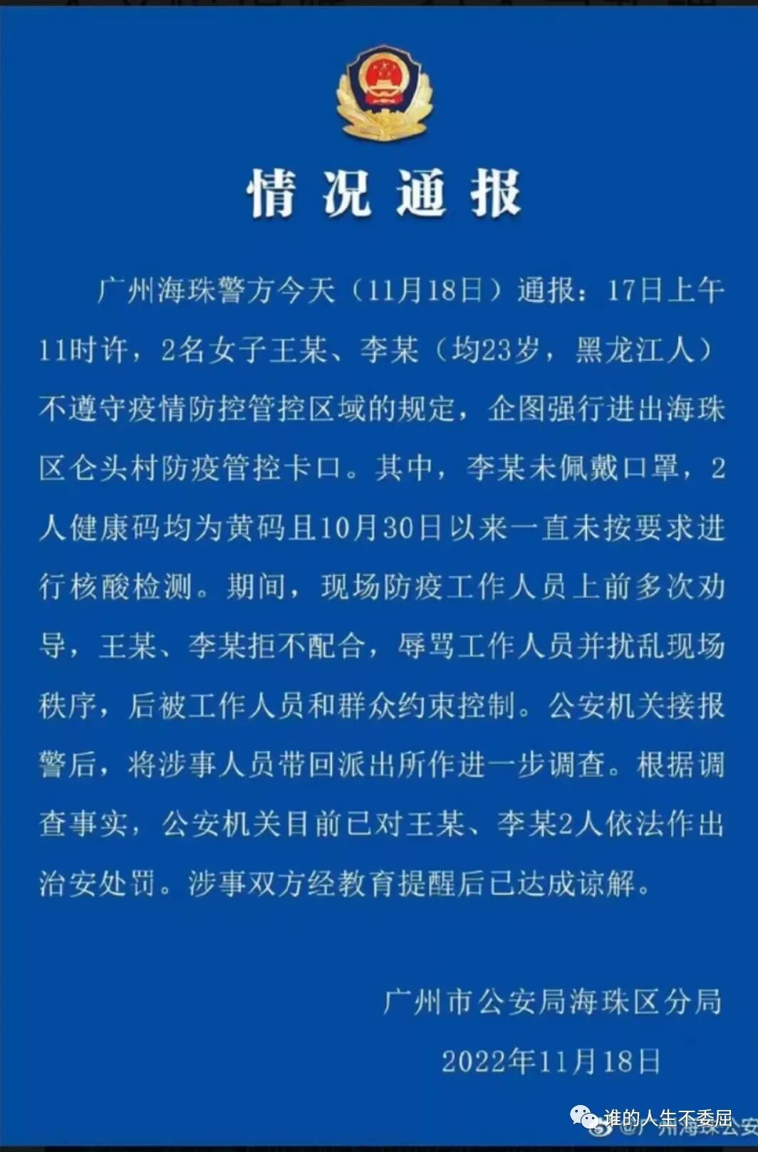 两名女子东北黑龙江人,均23岁。因不遵守疫情防控管控区域的规定,企图强行进出海珠区,仓头村防疫管控卡口。因李某未戴口罩,并且两人的健康码全部是黄码。经防疫人员仔细查询,两人已经18天没有按照街道要求进行核酸检测。