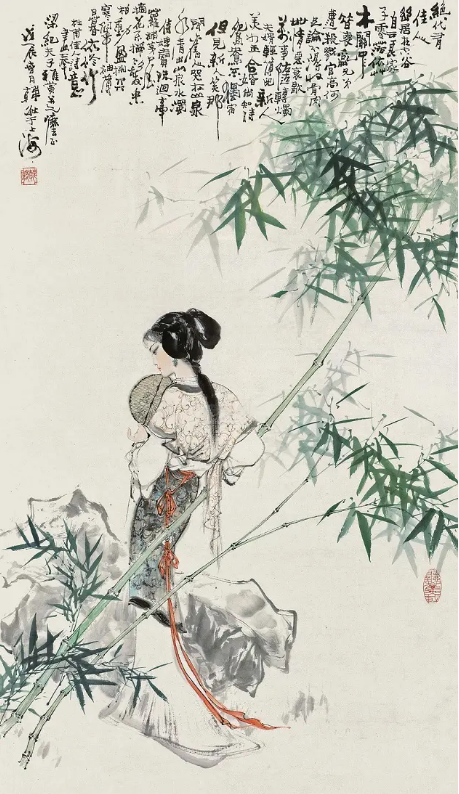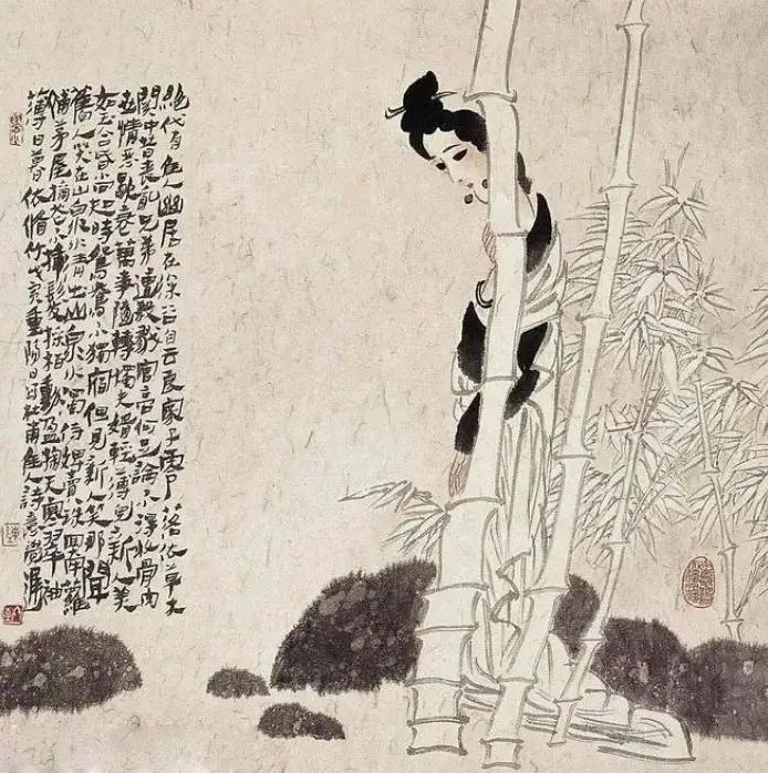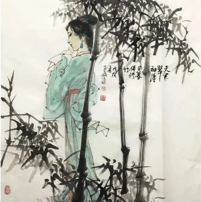 日落黄昏,那女子斜倚着青竹,寒风吹动她薄薄的衣衫。