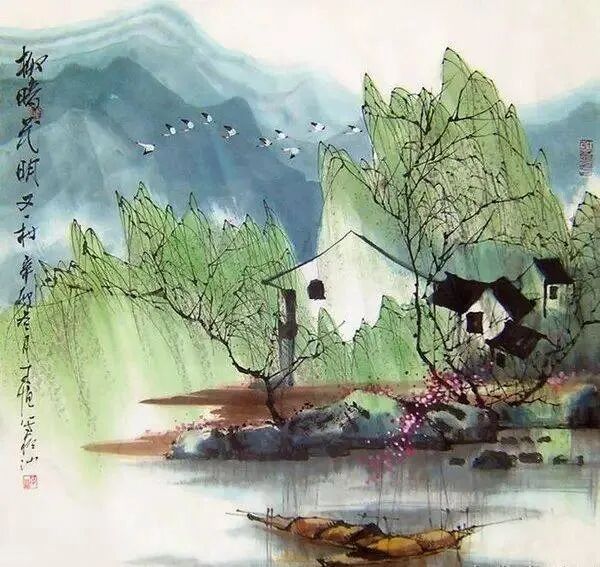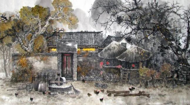 有农家茅舍数间,在花木扶疏之中,若隐若现。