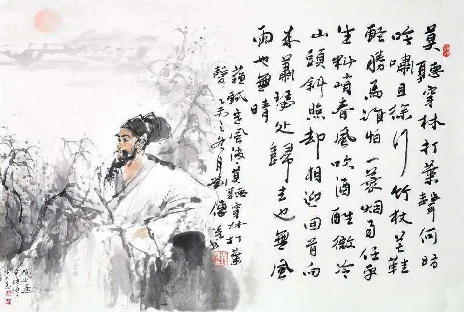 “莫听”、“何妨”四字,最能见出词人泰然处之的心态,风雨不足惧,外物不萦怀。