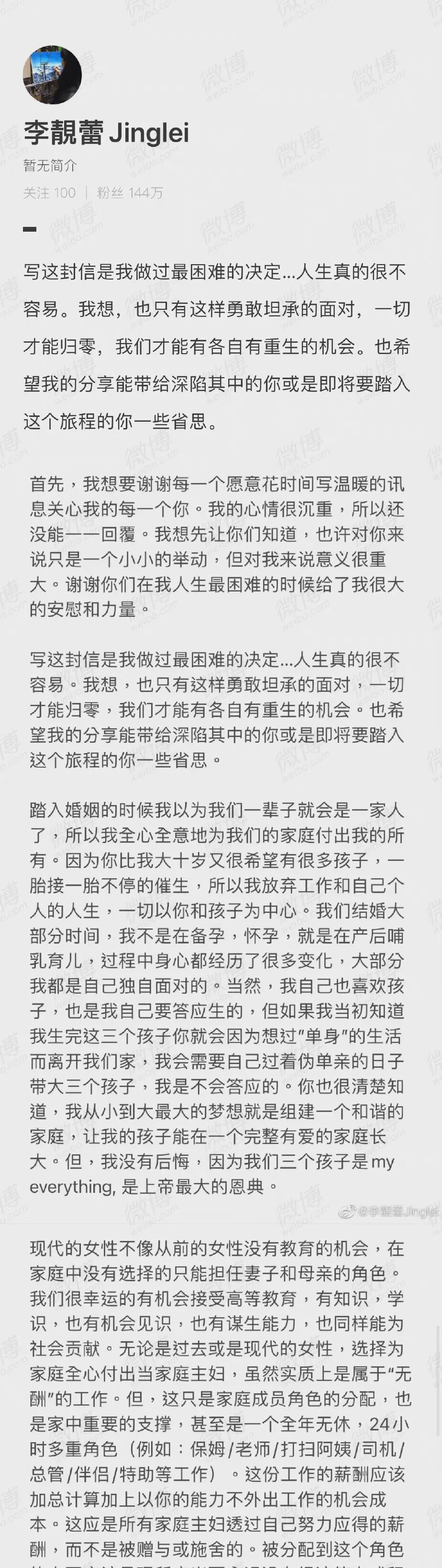 “即使经历了这么多诸如此类种种,我还是愿意选择原谅你,陪伴你,只是换一种方式,不奢望改变你了,让你自由的过你想要的生活方式,我退出了你的生活,就带着孩子们在家等着你,等你想回来的时候回来跟我们相聚,也不跟你吵架了。