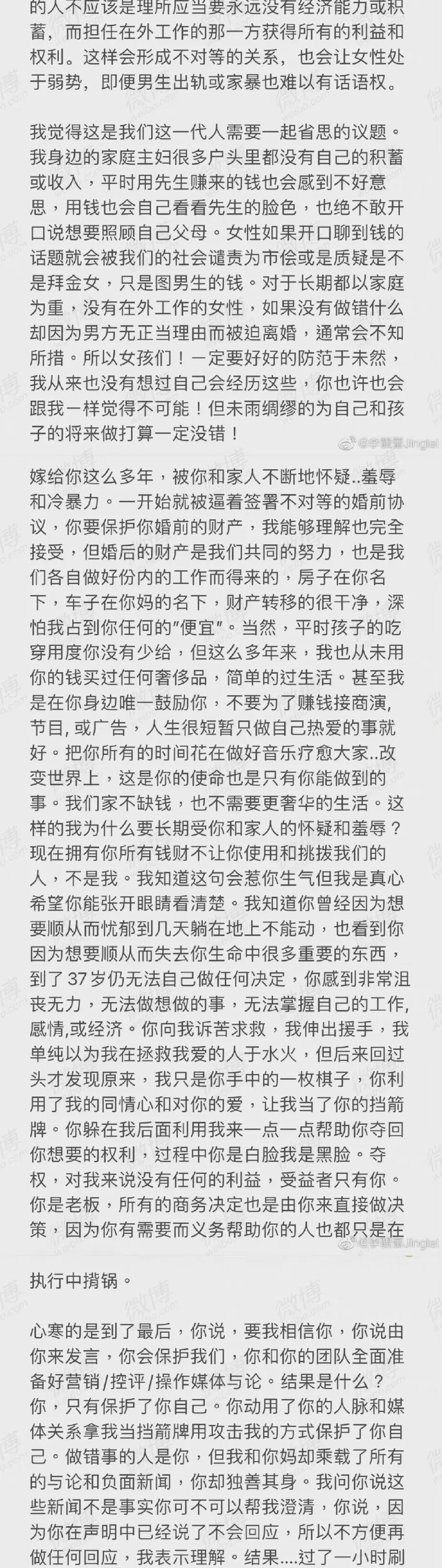 “嫁给你这么多年,被你和家人不断地怀疑、羞辱和冷暴力。一开始就被逼着签署不对等的婚前协议,你要保护你婚前的财产,我能够理解也完全接受,但婚后的财产是我们共同的努力,也是我们各自做好分内的工作而得来的。房子在你名下,车子在你妈的名下,财产转移得很干净,深怕我占到你任何的‘便宜’。”
