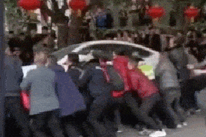 但其中一辆白色轿车,工作人员打了多通电话,都没能联系到人,情急之下,居民直接团结一心,将车掀进了旁边的绿化带里。