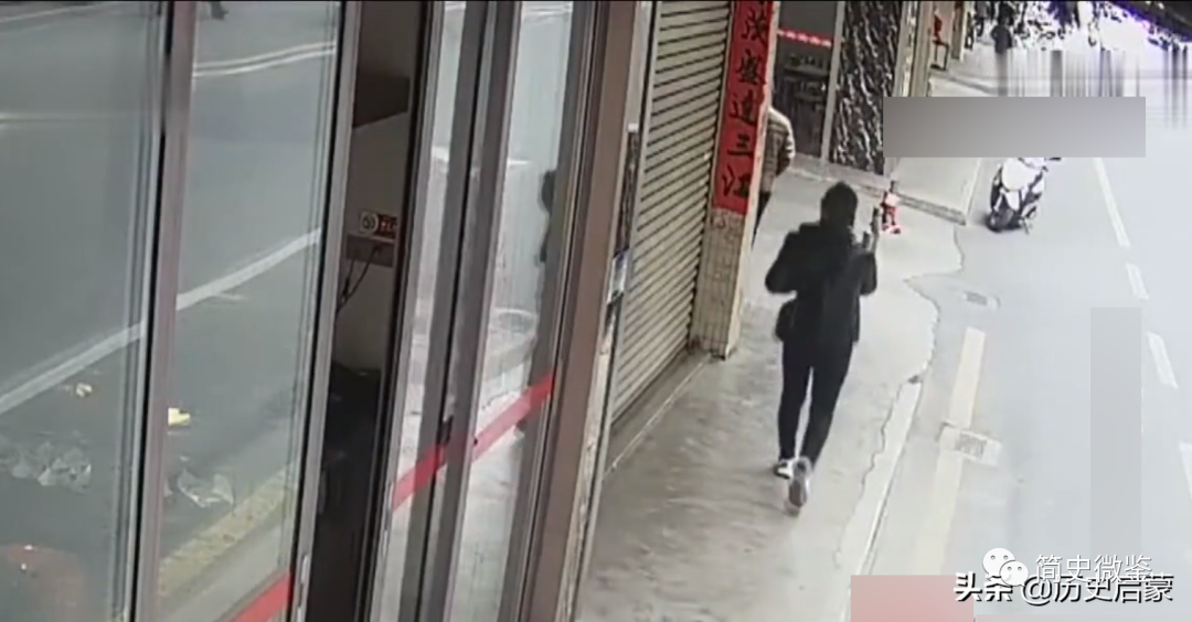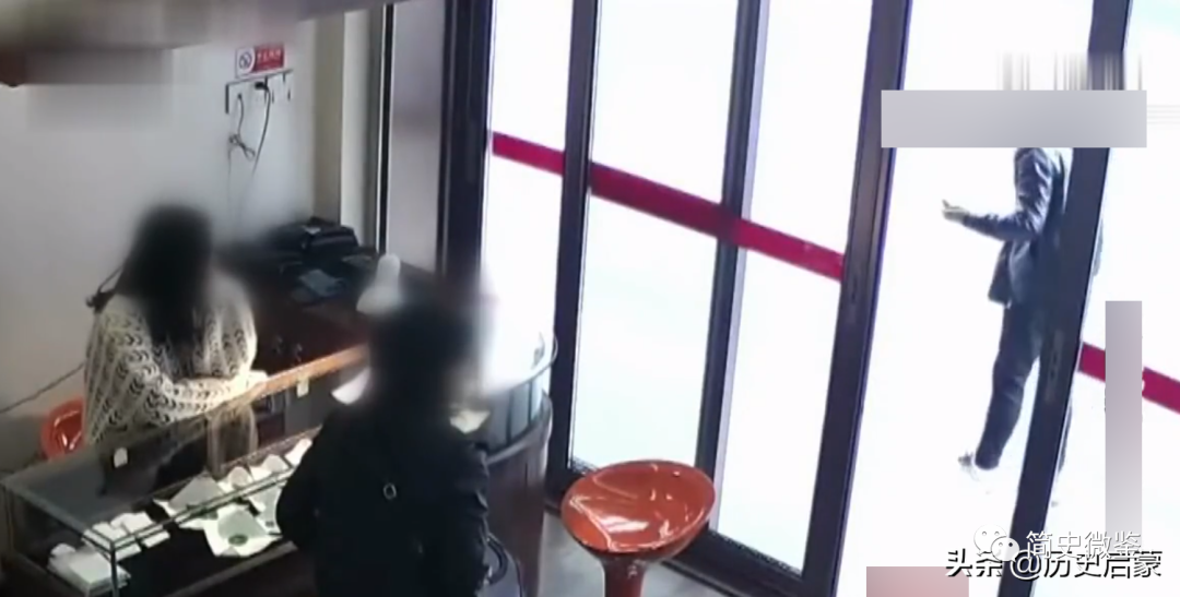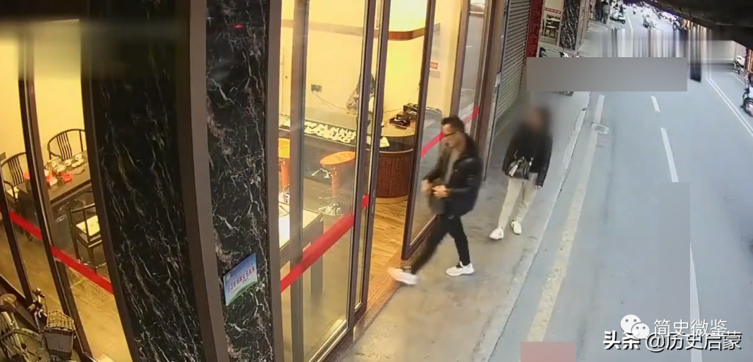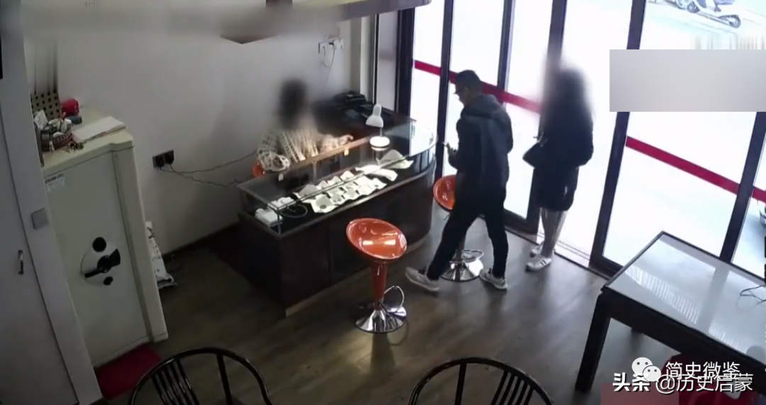 画面中,只见那名男子在门口边看着项链边打着电话,时不时地转身看向店内。不一会儿,向店内看了一眼后,就快速离去,消失在了拐角,此后再也没有出现。