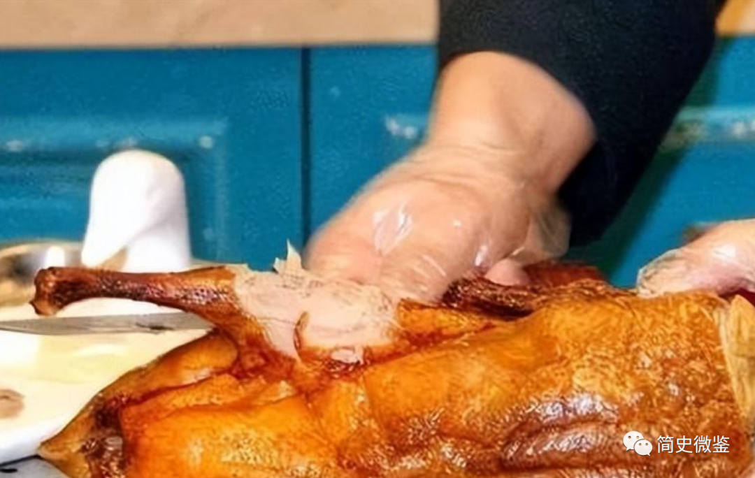这样的烤鸭在未加工之前就是一团烂肉,可经过一番改造、塑形,鸭子就好像整容了一样,变成了一整个。