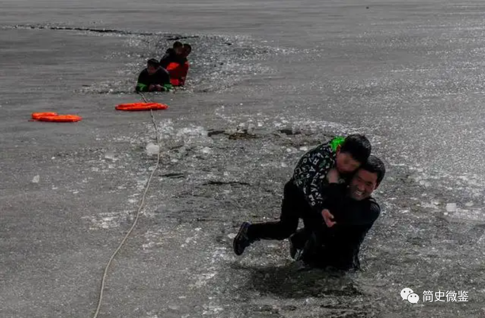 岸边的人见女孩也落水了,好几个会水的人纷纷走向冰面。这时,从人群中冲出一个男人。