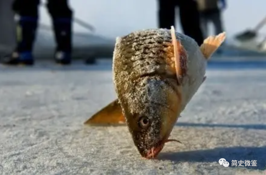 四人不知从哪里找来石头和木棍,对着小鱼一顿砸。鱼被冻在冰面上,不一会儿就被弄出来了。小孩们惊奇地观察着比巴掌稍大的冻鱼。