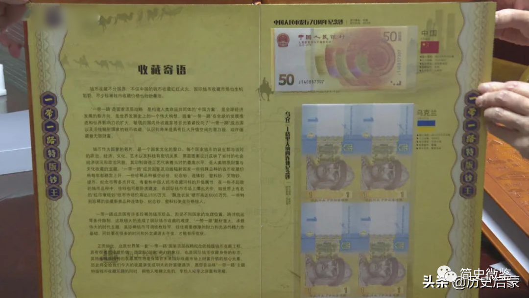 说着工作人员展示了公司主打的两套藏品:一款是“一带一路特版钞王:整版邮王”,一款是“一带一路亚投行纪念钞大全”,两套藏品里收藏的都是相关国家的钞票和邮票。