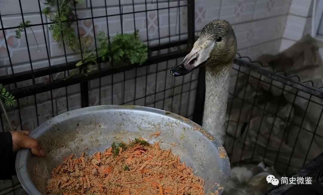 不知是威慑的话起了作用,还是大鹅真的饿了,这盆饲料大鹅吃得“狼吞虎咽”,看着它吃东西,老两口也露出笑容。