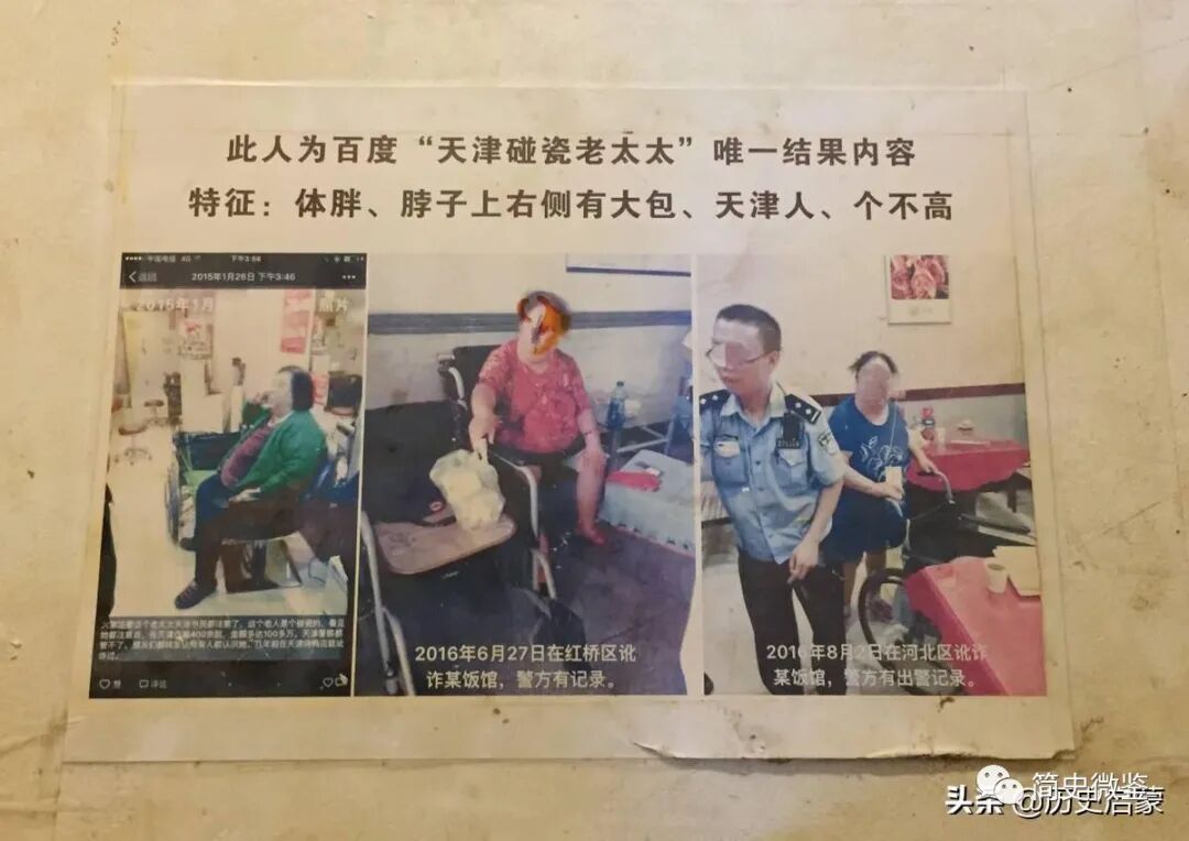 李先生气急败坏,从监控里找到杜大娘的照片,打印在A4纸上,并写上“此人为百度天津碰瓷老太太唯一结果内容,特征:体胖、脖子上右侧有大包、天津人、个不高,推轮椅。”