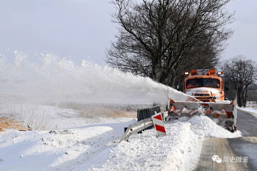 小卡车不停按喇叭,但是铲雪机工作时,移动速度不是很快,小卡车上的司机伸出头对他破口大骂,经过时甚至朝他竖中指。