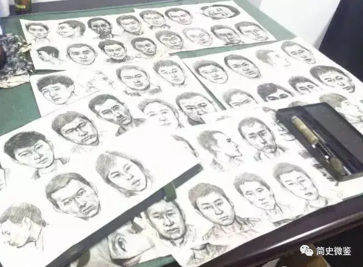 短短几年时间就画出十几万张人像。此外,他还画头部和身体各部位。将脸型、嘴、耳朵、眉毛、眼睛、鼻子拆分成不同的形状种类,收集成册后,反复组合、钻研。