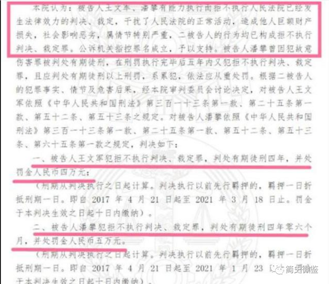 最终法院做出了如下判决:被告潘攀拒不执行判罚,被判处有期徒刑四年零六个月,罚金四万元,;被告王文军拒不执行判罚,被判处有期徒刑四年,罚金五万元。