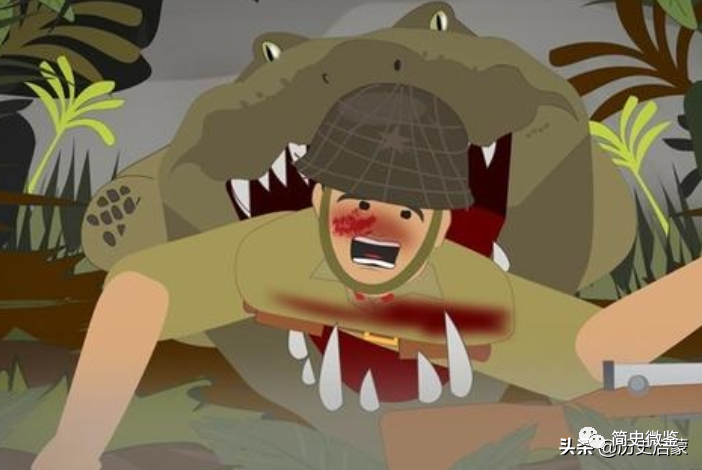 因为体力耗尽,有几个还能勉强活动的伤兵用手支撑着全身,稍微爬离了这个血腥的屠杀场;动不了的伤兵,只能眼睁睁地看着鳄鱼对自己张开血盆大口;而那些早已被饥饿以及热带病夺去生命的士兵,最终沦为鳄鱼的美餐……