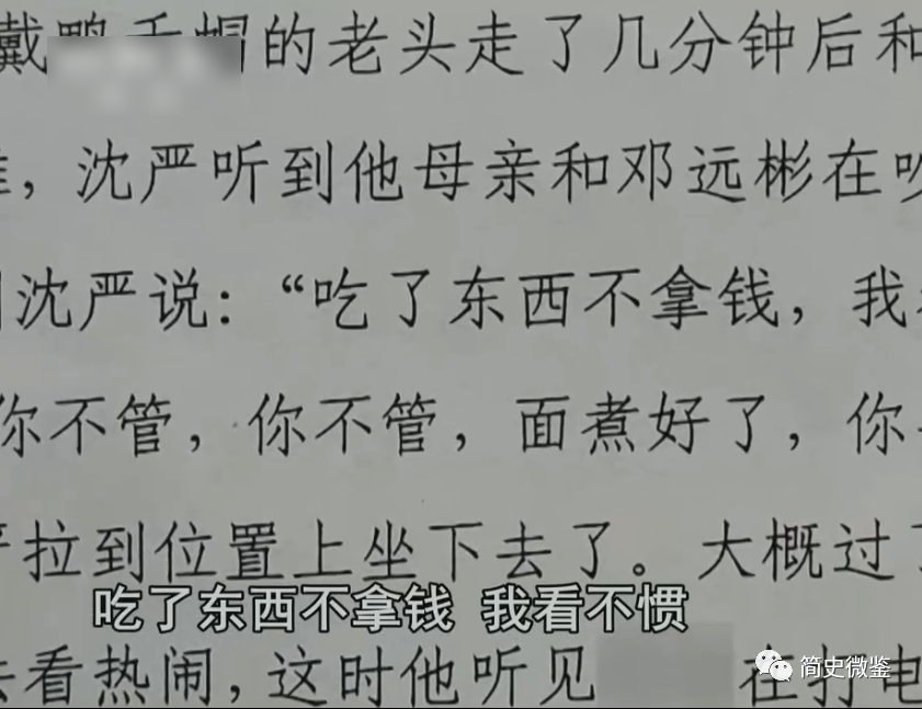 而女友表示,当沈严第一次被拉回来后,他们还能听到面馆的争吵声,沈严此时对她说道:“那个嬢嬢这么大年纪熬夜做生意不容易,一碗面才多少钱,如果那个老头(邓远彬)要跑,我就过去把他拦下。”