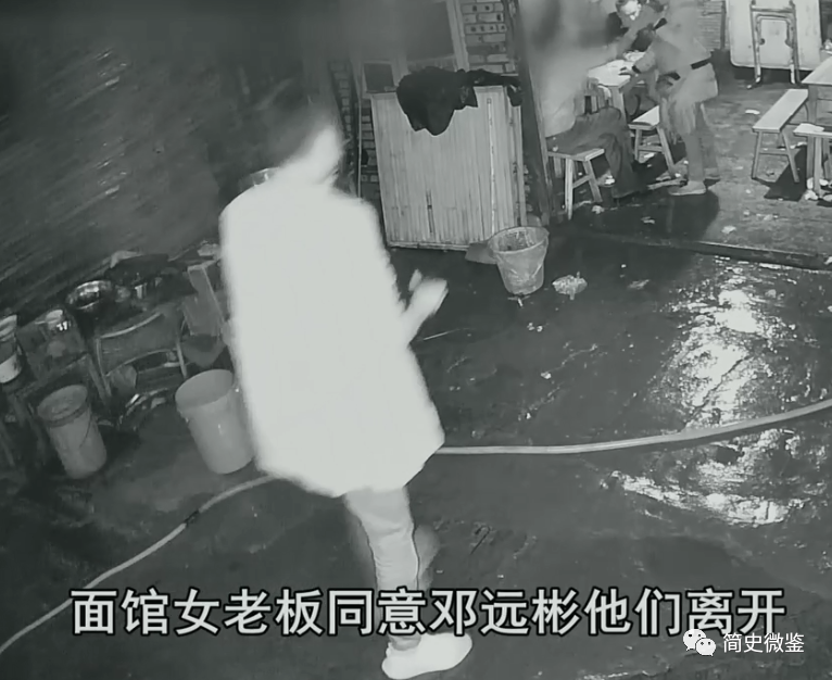 当三人走出监控范围几秒后,原本收拾东西的老板娘愣了一下,立马冲出面馆。此时,邓远彬已经用携带的水果刀刺伤了沈严,然后跑着离开了现场。