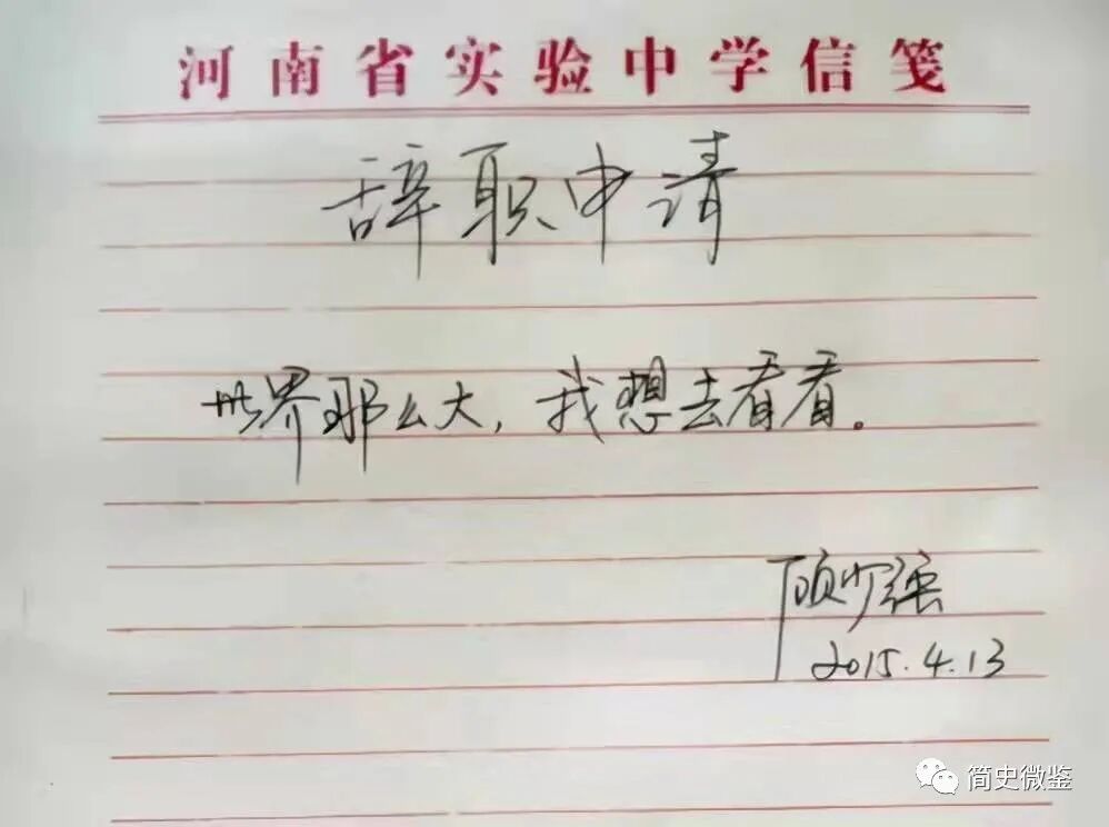 追求自由是人与生俱来的天性,而无数的琐碎将生活变成一座围城,人总想逃出现有的圈子去看一看外面的世界,顾少强就是这样的人。于是她在做教师十年之后,突然将辞职信送到了校长的桌子上。而信上的内容在当时看来非常离谱“世界这么大,我想去看看。”以至于学校跟她确认了好多遍,想知道她是不是受了什么刺激所以才突发奇想,为什么放着干了这么多年的“铁饭碗”不要,而是去追寻什么自由。但顾少强说自己并不是一时冲动,这封信是理性思考后的结果。最后领导竟然也不再过问,而是麻利地批准了她的离职。就这样顾少强一身轻装,踏上了拥抱世界的道路。而这封“任性”的辞职信也爆红网络,被人们称为“最有情怀的辞职信”。